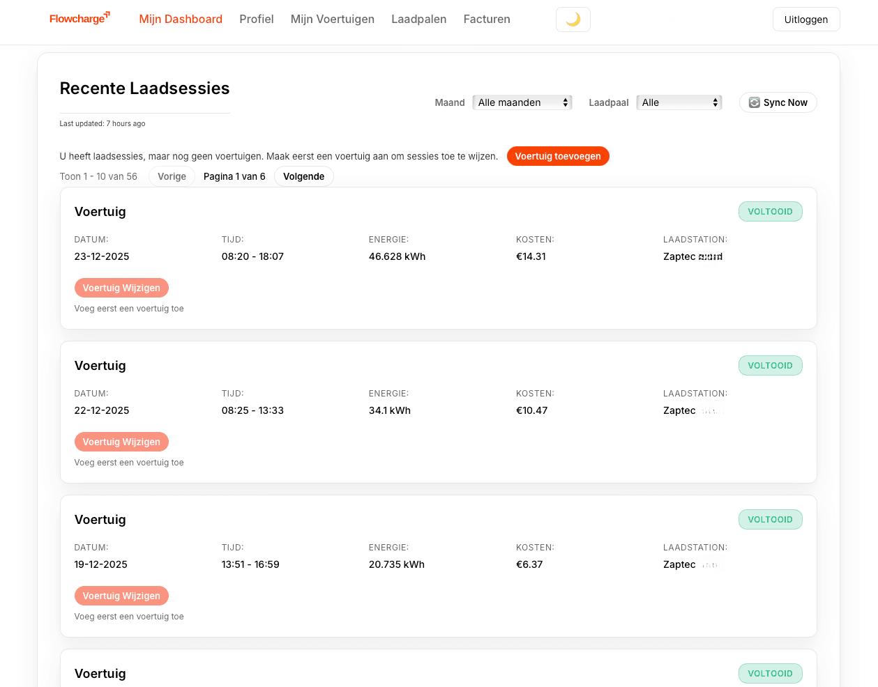Zie alle laadsessies, kostprijs en terugbetalingen in één duidelijk overzicht - volledige controle!